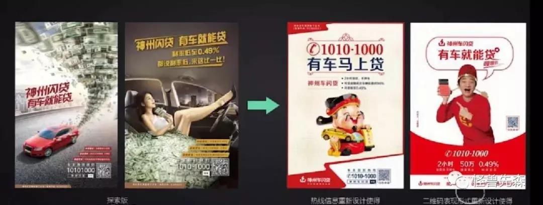 比如知名营销人杨飞(瑞幸咖啡 CMO)在分享他们做的一个神舟贷款产品的广告海报时,最终海报带来的很高的转化率。有人说为什么可以一张海报带来这么高的转化率。其实这也是不断小范围测试,不断优化的结果。下面从左到右,多次测试后发现第四张是最高转化,然后才大量投放。