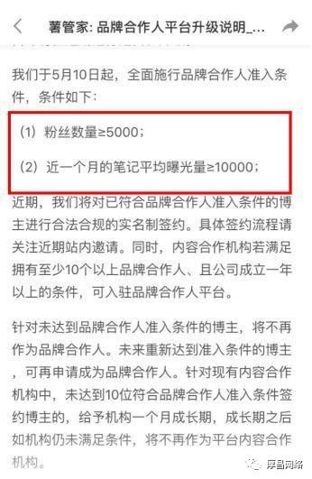 5月10日,小红书发布《品牌合作人平台升级说明》,对粉丝量和月曝光量作出更高要求,一些不符合要求的KOL被取消品牌合作人的资格,不能再接广告。